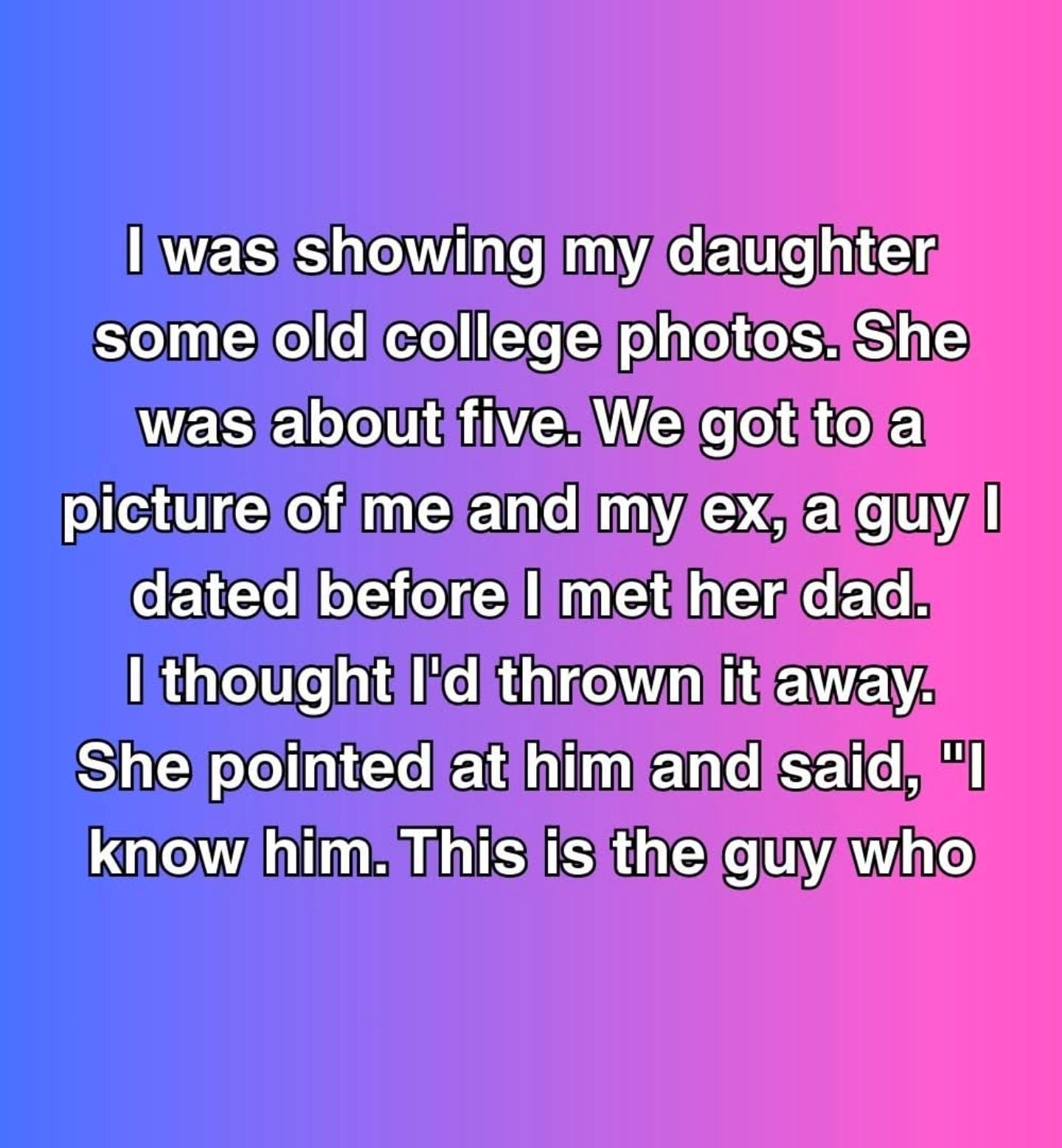 I was showing my daughter some old college photos when we came across one of me and Nico, an ex from before I met her dad. I thought I’d thrown that picture away, but there it was. My daughter pointed at it and said, “I know him. This is the guy who gave me the bracelet at the fair.” My stomach dropped. I hadn’t seen Nico in nearly seven years, not since I left our life in Charleston for Atlanta. But my daughter remembered him from a random encounter at a tiny fair months ago—an encounter that felt too coincidental to ignore.