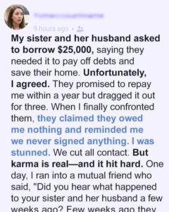 My sister and her husband asked to borrow $25,000, insisting they needed it to pay off debts and save their home. I hesitated—money and family rarely mix—but they sounded desperate. My sister cried, telling me they’d be homeless without help. Against my better judgment, I agreed.