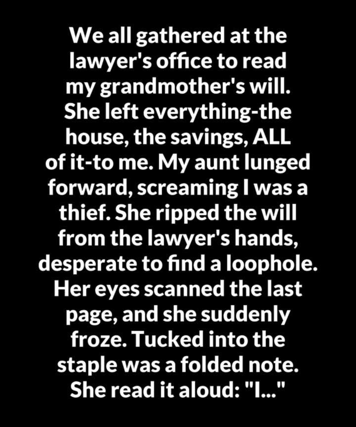 When her grandmother’s will was read, Ellie was stunned to learn she had inherited everything. Her Aunt Trish erupted in anger, accusing her of manipulation, but a note attached to the will made it clear the decision was intentional. Ellie had never expected anything—she had simply been the granddaughter who visited weekly, helped with chores, and kept her grandmother company. While others assumed the house would be theirs, she had only given time and care.