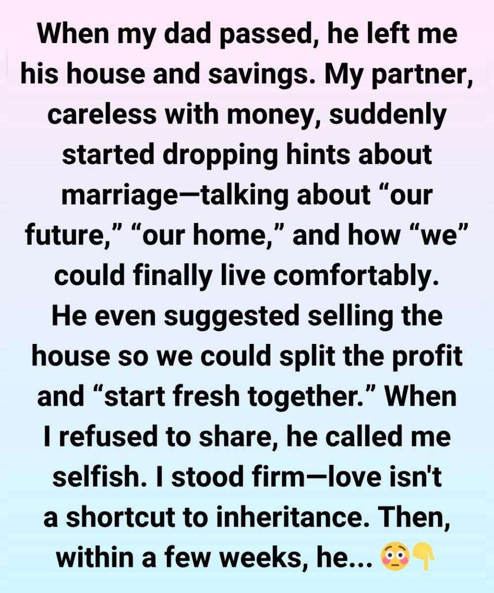When my father passed away, he left me his house and some savings—security he had carefully planned so I wouldn’t struggle. While I was grieving, I also felt grateful knowing he had protected my future. At the time, I had been in a three-year relationship where we kept finances separate, and I often carried more of the financial responsibilities. Money had never been my partner’s strength, but I hadn’t seen it as a breaking point—until the inheritance.