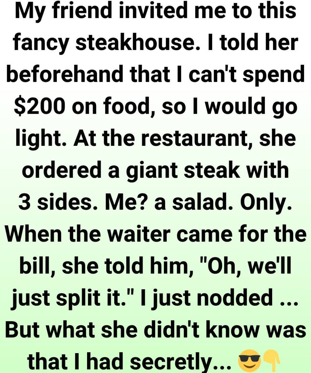 At dinner, she ordered an elaborate meal while I kept it simple with a salad and water. Everything felt relaxed and enjoyable—until the check came and she casually suggested we split it.