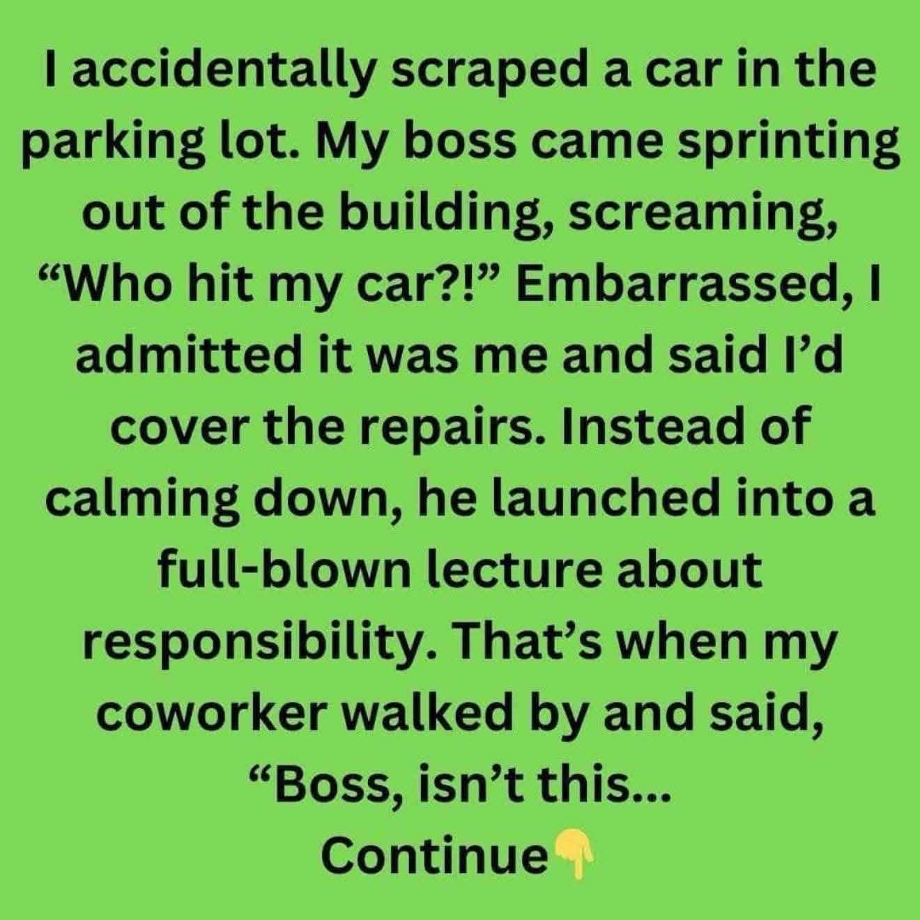 That’s when a coworker casually walked by and said, “Wait… isn’t this the company car you scratched last week?”