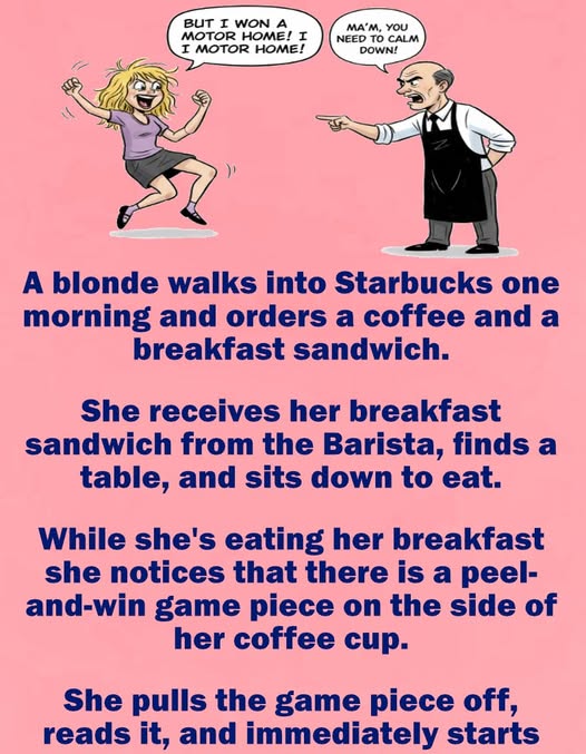 She pulls the game piece off, reads it, and immediately starts screaming and shouting “OH my god – I won a motor home! I won a motor home!” at the top of her lungs.