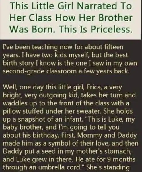 She explained that first her mom and dad made him “as a symbol of their love,” then her dad “put a seed in Mom’s stomach” and Luke grew there for nine months, eating through an “umbrella cord.” The class watched in amazement while I tried my best not to laugh. Erica then began acting out the story, groaning and waddling around the classroom to imitate her mother going, “Oh, oh, oh!” around the house when the baby was ready to come.