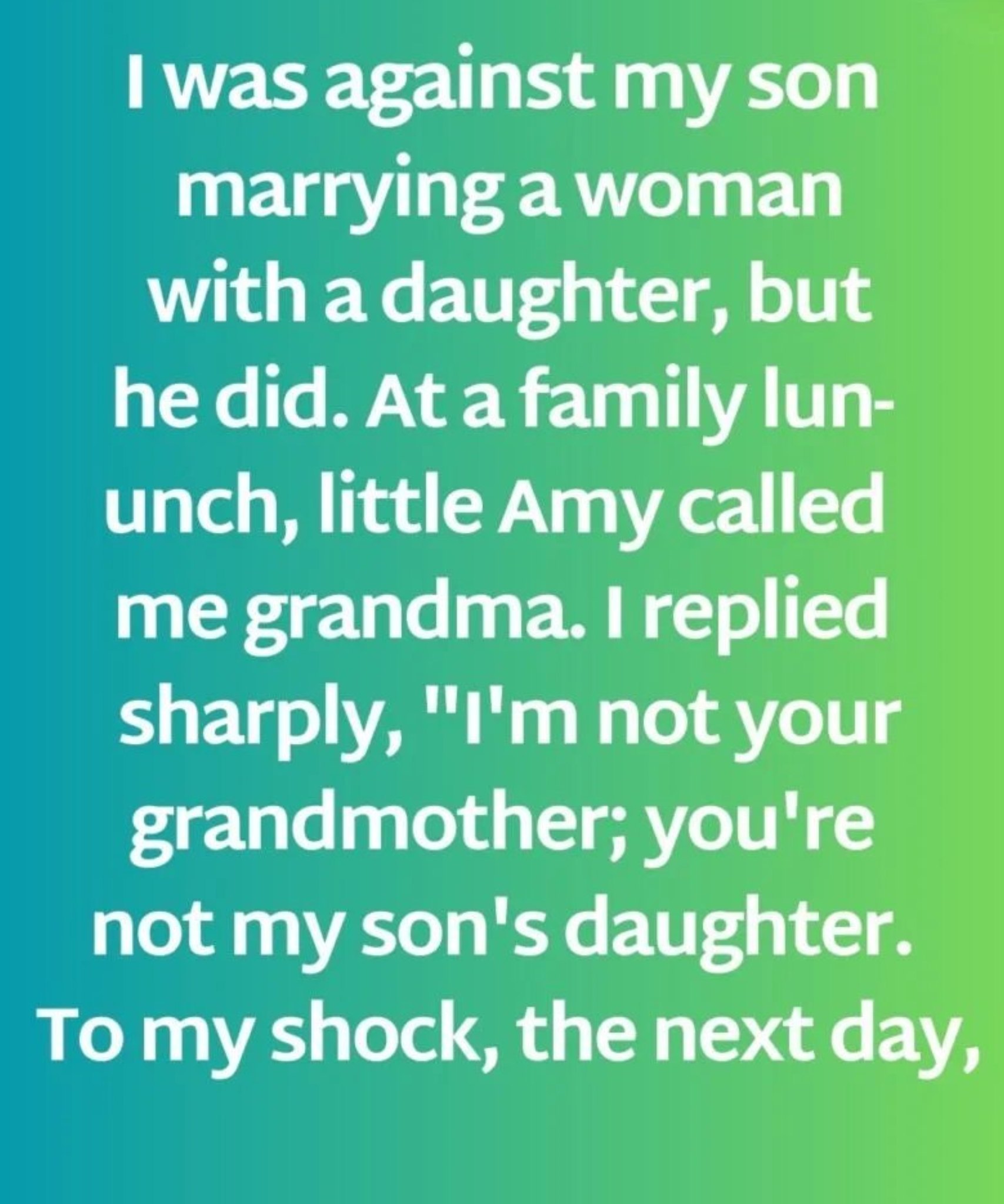 What began as a simple family lunch quickly turned into a moment I would never forget. Sunlight filled the room, plates clinked softly, and laughter drifted around the table as everyone enjoyed the easy comfort of being together. Then little Amy looked up at me with wide, trusting eyes and said one simple word: “Grandma.” It should have warmed my heart, but instead something inside me tightened. Before I could stop myself, I replied coldly, “I’m not your grandmother.” The words fell into the room like glass shattering, and the cheerful noise around the table disappeared instantly.