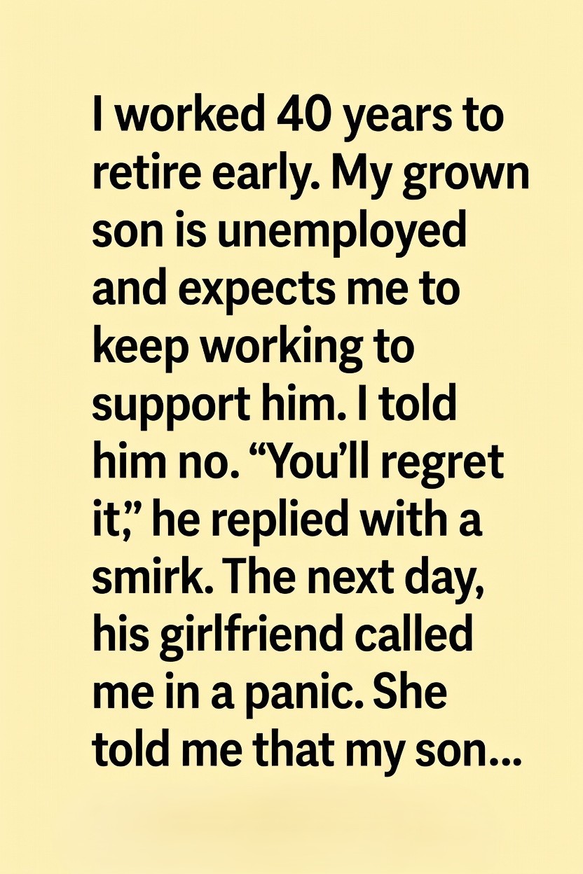 My grown son, however, had different expectations. He had been struggling to find stable work, and instead of seeking new opportunities, he began to rely on me financially. One evening, he said, “You’ll need to keep working so you can help me out.” I took a deep breath and gently told him, “I love you, but I’ve worked my whole life for this moment. I can’t keep working just to support you. It’s time for you to take responsibility.”