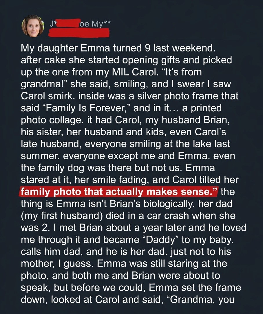 For Emma’s ninth birthday, we threw a cheerful backyard party with balloons, cake, and friends. The mood changed when Emma opened a gift from Carol. It was a beautiful silver frame engraved with “Family Is Forever,” but the collage inside showed every member of Brian’s family except Emma and me. The message hurt, and Emma quietly looked at Carol and said, “Grandma, I love you and I love Mommy and Daddy. I just hoped you’d love me too.” The entire yard fell silent.