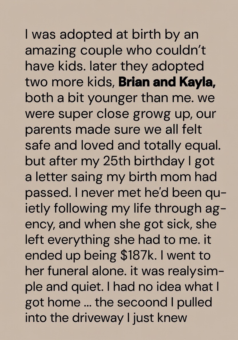 Growing up, I believed I was lucky. I had been adopted as a baby by loving parents who later adopted two more children, Brian and Kayla. We were always told that we were “chosen” and equally loved, and for years I believed that completely. But on my 25th birthday, everything changed when I received a letter from a lawyer. My birth mother, Alina, had passed away and left me her entire estate—$187,000. I was overwhelmed with emotion and expected my family to support me during such a confusing and emotional moment.