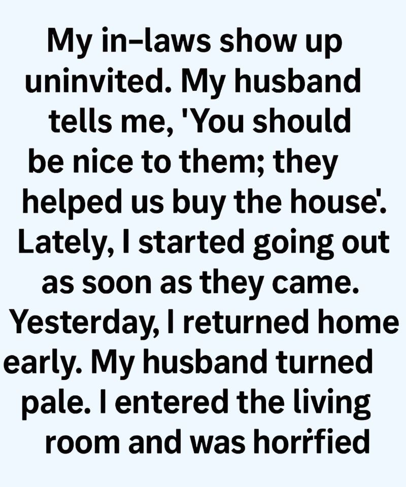 My in-laws never knocked. They simply showed up whenever they wanted—Sunday mornings, random weekdays, even once late at night with leftovers I never asked for. My husband always brushed it off with the same excuse: they had helped us with the down payment on the house. At first I tried to be polite, making coffee and pretending not to notice my mother-in-law criticizing everything from my cooking to the curtains. Eventually, I stopped arguing and just left whenever they arrived, choosing errands or long drives over another uncomfortable visit.