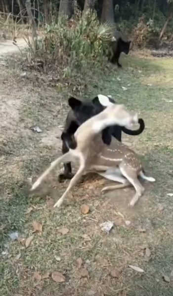 A dramatic wildlife scene has been captured showing two black panthers attacking a deer in what appears to be a powerful moment of nature’s raw survival instinct.