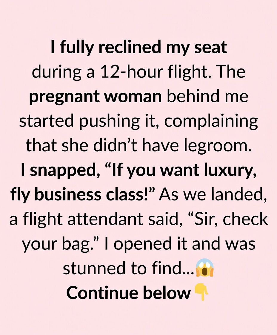 I fully reclined my seat on a 12-hour flight, brushing off the pregnant woman behind me who kept pushing it forward and asking for more space. Annoyed, I snapped, “If you want luxury, fly business class!” Later, as we landed, a flight attendant told me to check my bag. Inside, instead of my belongings, I found baby items—a neon-pink onesie, formula, and a stuffed giraffe. My essentials were gone. After some panic, I realized I had taken the wrong bag—belonging to the woman behind me, Kavita.
