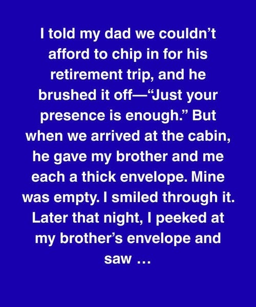 I told my dad we couldn’t afford to contribute to his retirement trip, and he brushed it off, saying our presence was enough. But when we arrived at the cabin, he handed my brother and me each an envelope—mine empty, his holding a $15,000 check. I kept my composure, but later that night I quietly checked his envelope just to be sure. Seeing the amount confirmed what I already feared, and although I put it back exactly where I found it, the weight of that moment stayed with me.