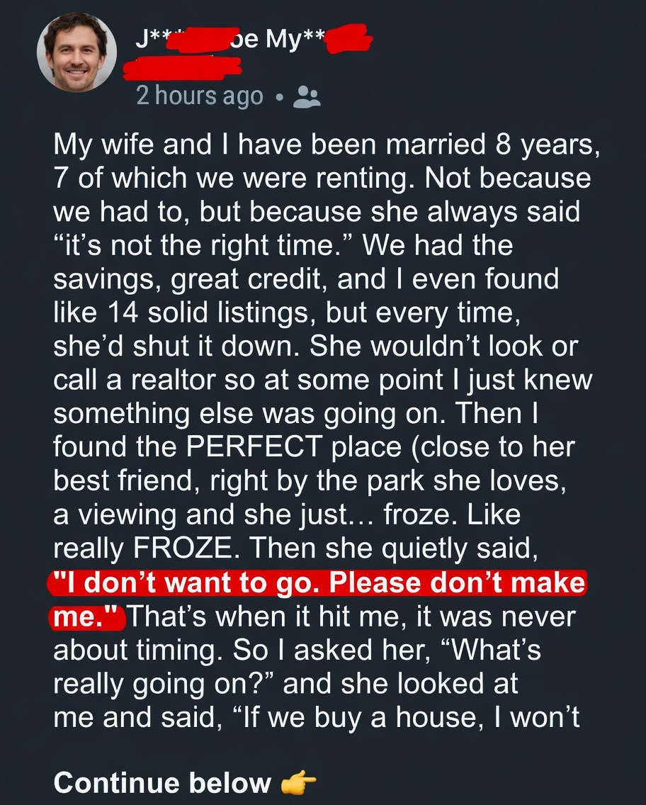 Jane and I had been married for eight years, but for most of that time, she resisted the idea of buying a house. We had the money, stability, and good credit, yet every time I brought it up, she would quietly say, “It’s not the right time.” At first, I thought it was about finances or timing, but as the years passed, I realized something deeper was holding her back. When I finally found the perfect house and suggested we go see it, her reaction wasn’t hesitation—it was fear.