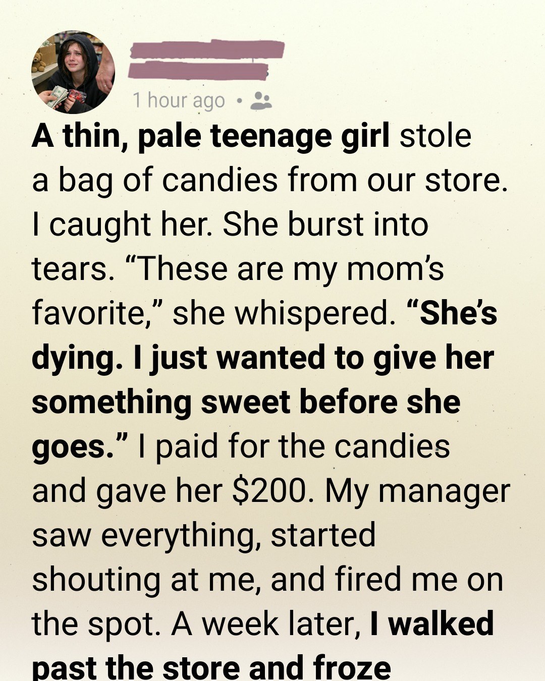 I was working a quiet late shift when I noticed a teenage girl lingering near the candy aisle, her hands trembling as she slipped a small bag into her pocket. When I gently stopped her, she didn’t run—she broke down, sobbing as she explained the candy was for her dying mother, who had only days left. Something about her story felt real, so I paid for the candy myself and, without overthinking, gave her some money to help. She hugged me tightly, whispered thank you, and ran out, leaving me shaken but certain I had done the right thing.
