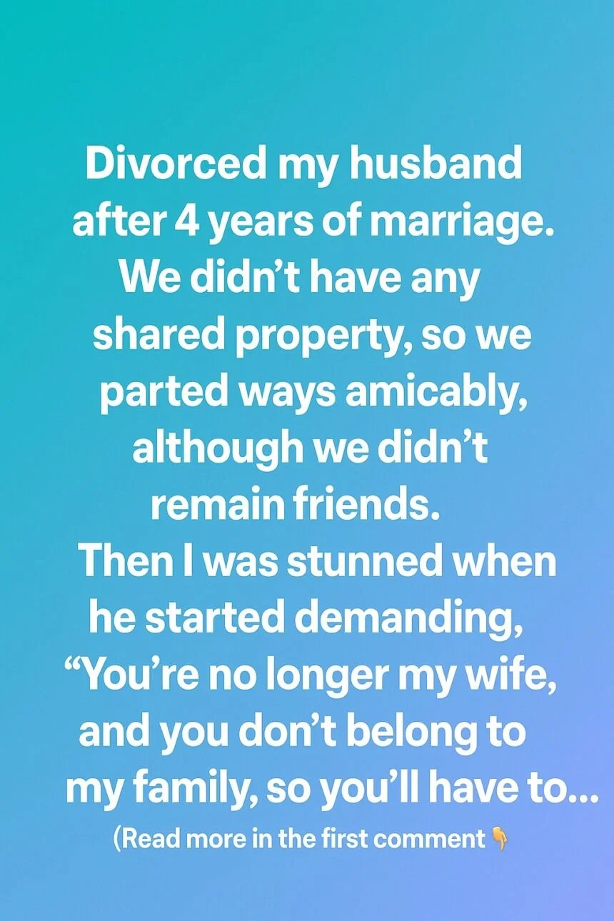Divorced my husband after four years of marriage, we parted ways peacefully, with no shared property and no major conflicts. I truly believed that would be the end of it—a clean, respectful closure. But not long after, he said something that completely caught me off guard: “You’re no longer my wife, and you don’t belong to my family, so you’ll have to cut all ties.” His words lingered in my mind, not because of anger, but because of how differently we seemed to understand what moving on actually meant.