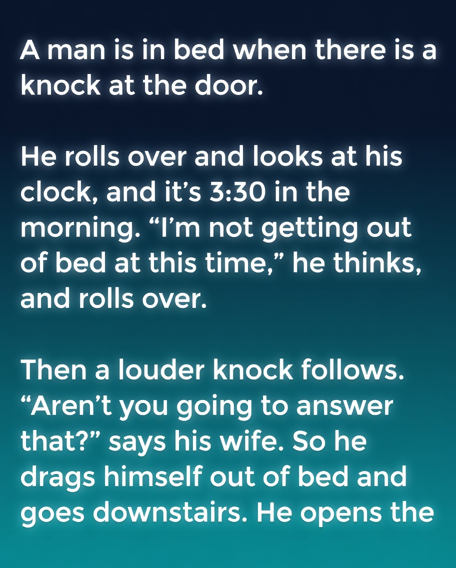 It was 3:30 in the morning when the first knock came. I stirred, glanced at the glowing clock, and groaned as I turned over, hoping it would stop on its own. But the silence didn’t last. A second knock followed—louder, more urgent—cutting through the stillness of the night. My wife lifted her head beside me and asked if I was going to answer it. With a sigh, I dragged myself out of bed, already dreading the cold floor and the interruption.