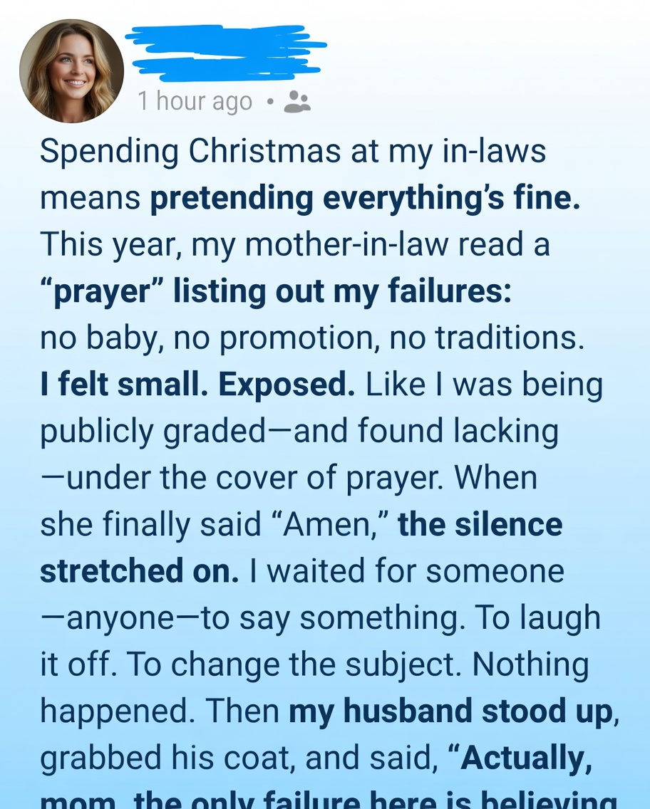 After dinner, we gathered in the living room for what she called a “special Christmas moment.” She announced a prayer, and everyone bowed their heads. At first, her words sounded gentle—gratitude for family, for tradition. But then the tone shifted. She began praying for “those who have strayed,” for “those who haven’t fulfilled their roles,” for “those without children,” for “those who haven’t progressed despite opportunity.” Each phrase landed heavier than the last. She never said my name, but she didn’t need to. I felt exposed, humiliated, like I was being judged in front of everyone while no one said a word. Not even my husband.