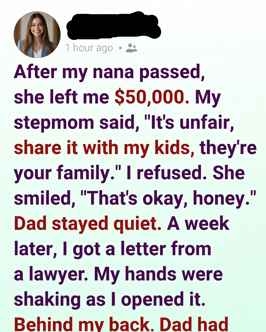 For a week, I held onto that promise. Then my stepmom called me into the kitchen with that gentle tone that always made things sound reasonable. She smiled and told me it didn’t seem fair for me to keep the money to myself—that my step-siblings were family too, and surely my nana would’ve wanted everyone included. I stayed calm, reminding her that the decision had already been made. She nodded like she understood, but something in her expression told me this wasn’t over. Across the table, my dad said nothing—and somehow, that silence felt worse than any argument.