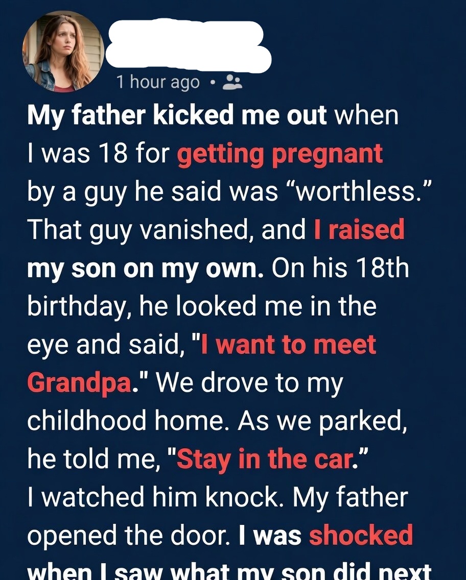 When Daniel turned eighteen, everything shifted again. We were sitting in my old car after a small birthday breakfast when he told me he wanted to meet his grandfather—my father, the man who had cut me out of his life without hesitation. The request knocked the air out of me. I hadn’t spoken to him in eighteen years, not once, not even a letter. But Daniel wasn’t angry or demanding. He was calm, steady, certain in a way I didn’t fully understand. And against every instinct I had, I agreed to take him to the house I had spent half my life trying to forget.