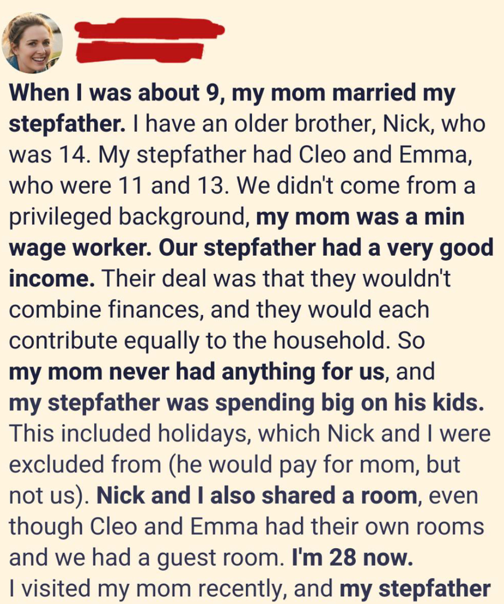 Growing up, I watched my stepdad Liam book Disney trips and beach resorts for his daughters while my brother Nick and I stayed home pretending it didn’t matter. After my biological father left, Mom worked nonstop just to keep us afloat. When she married Liam, she said keeping finances “separate but equal” would be fair. On paper, it was. In reality, Mom paid half the bills on a near-minimum wage salary while Liam, comfortably established, had plenty left for new phones, brand-name clothes, and elaborate vacations for Cleo and Emma. They had decorated bedrooms; Nick and I shared bunk beds beside an unused guest room. We learned early that we lived in the house, but we were never fully part of the family.