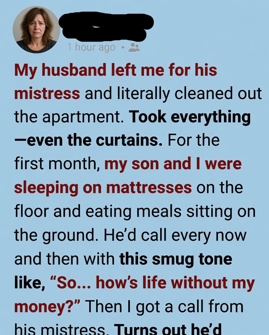When my husband left, he didn’t just walk out—he emptied our life down to the walls. He took the furniture, the appliances, even the curtains, leaving behind an echoing apartment and a confused eight-year-old asking where the couch had gone. The first weeks were brutal. My son tried to call it an “adventure,” but I saw the truth in the small things—the way he folded clothes without a dresser, the way we ate on the floor.