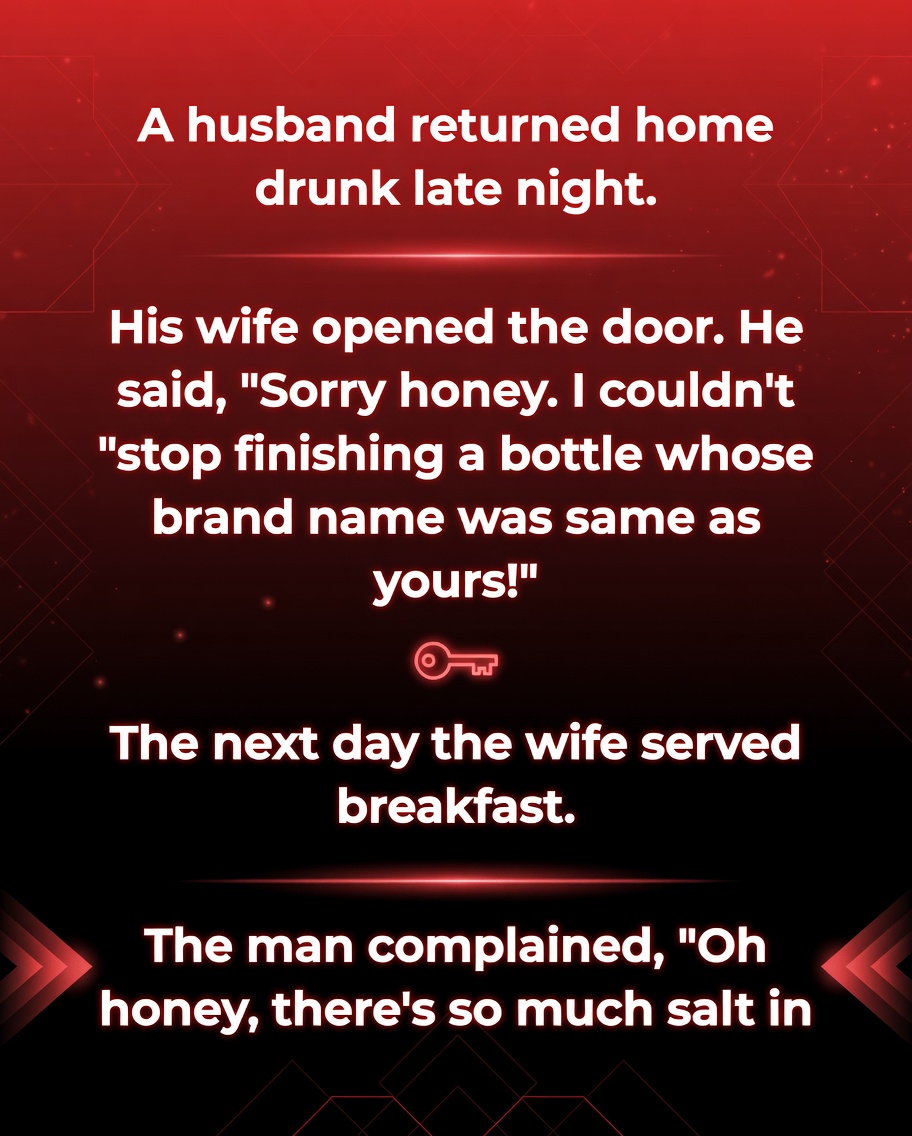 One night, a husband stumbled home drunk and tried to joke his way out of trouble, blaming his behavior on a drink that shared his wife’s name. The next morning, his wife cleverly mirrored his excuse by oversalting his breakfast, reminding him that careless words and actions can come back around. What seemed like humor carried a deeper message—respect in a relationship isn’t something to take lightly or joke about.