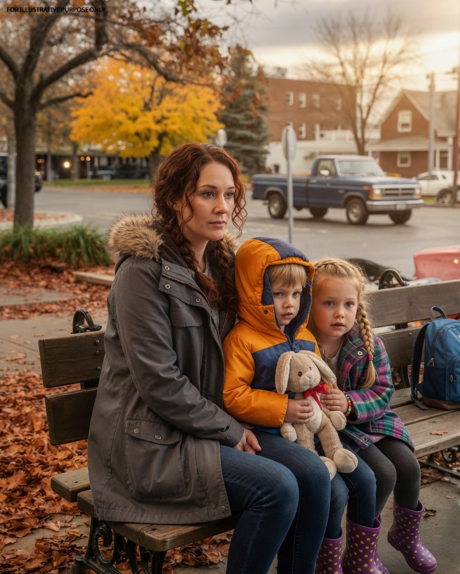 Nine days after leaving my husband, I sat on a park bench in Dayton with my two daughters, eleven dollars left, and a carton of lukewarm rice between us when my youngest whispered, “Mommy… Bunny is blinking.” I followed her gaze and saw it—a tiny light pulsing from inside her stuffed rabbit’s torn ear. At the same moment, a blue truck rolled slowly through the parking lot, not searching, not wandering—moving like it already knew where we were. My heart dropped. I didn’t need proof to understand. He had never stopped watching us.