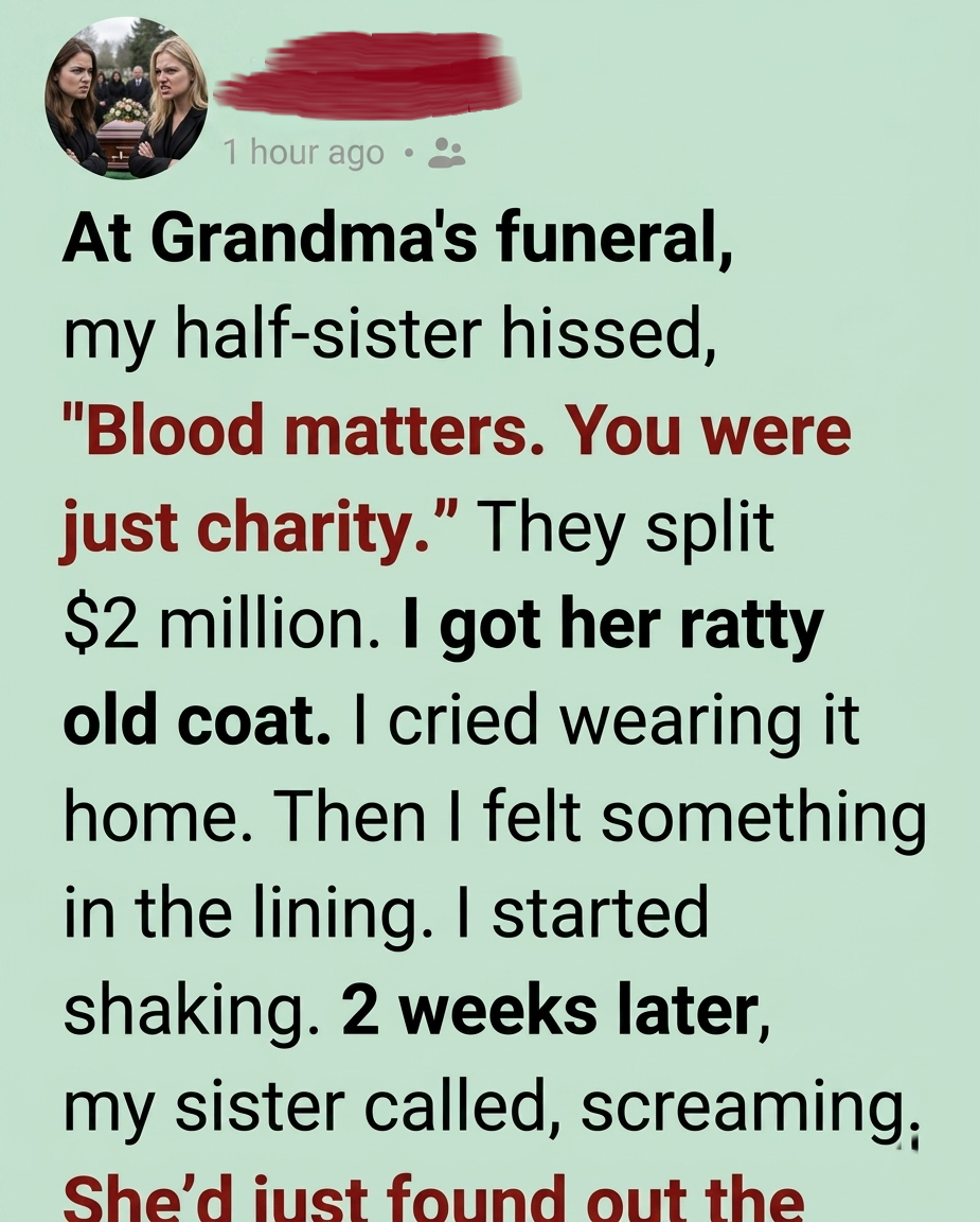 At the lawyer’s office, the will reading confirmed everything Victoria had always believed. She received the house, the money, the jewelry, and the antiques she adored. I was left with a few boxes of books, some old photographs, and Grandma’s worn wool coat. Victoria laughed at it, calling it worthless, and I forced myself to carry it home without breaking. That night, wrapped in the faint scent of lavender, I finally let myself cry, whispering into the fabric that I hadn’t been charity—I had been loved.