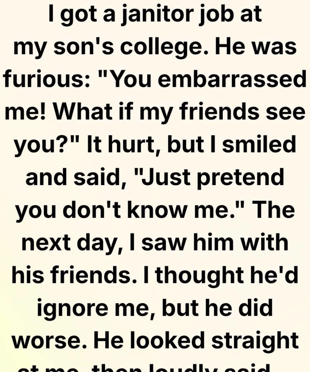 Marissa, a forty-nine-year-old single mother, finally found stability after years of juggling multiple jobs to support her son, Logan. When she secured a full-time janitorial position at the university he attends—complete with benefits and a steady schedule—it felt like long-overdue relief. Proud and hopeful, she shared the news with Logan, only to be met with shame and rejection. He called her job embarrassing and walked away, leaving her hurt but determined to work anyway.