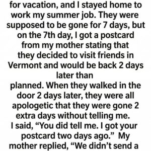 At seventeen, the narrator was left alone while their family vacationed in Canada, and the empty house felt overwhelmingly quiet. On the seventh day, a postcard arrived…