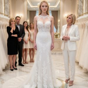 At her bridal fitting in an exclusive boutique, Camille stood in a breathtaking $14,000 white gown when her fiancé’s mother, Beatrice Sterling, shattered the moment with a…