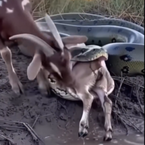 A dramatic wildlife moment has taken social media by storm after images surfaced of a goat confronting a massive snake at the edge of a muddy riverbank….