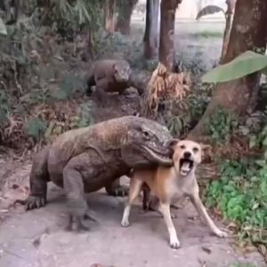 In a terrifying scene straight out of the wild, a massive monitor lizard lunges at a helpless dog on a quiet path surrounded by trees. The reptile…