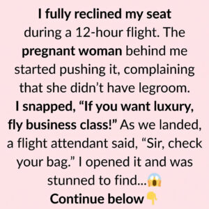 I fully reclined my seat on a 12-hour flight, brushing off the pregnant woman behind me who kept pushing it forward and asking for more space. Annoyed,…