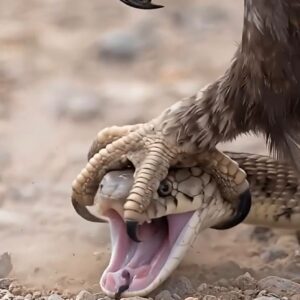 In the harsh, sun-baked expanse of the wilderness, a powerful eagle descends with lethal precision. Its massive talons lock onto the cobra’s head in an iron vice,…