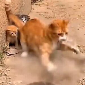 In a tense backyard encounter captured on video, a determined orange tabby cat confronts a large, coiled snake that has slithered dangerously close to her tiny litter….
