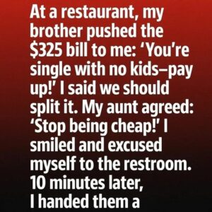 At a restaurant, my brother shoved the $325 bill toward me. “You’re single with no kids—pay up!” he said. I suggested we split it, but my aunt…